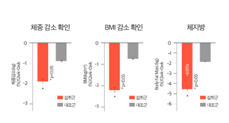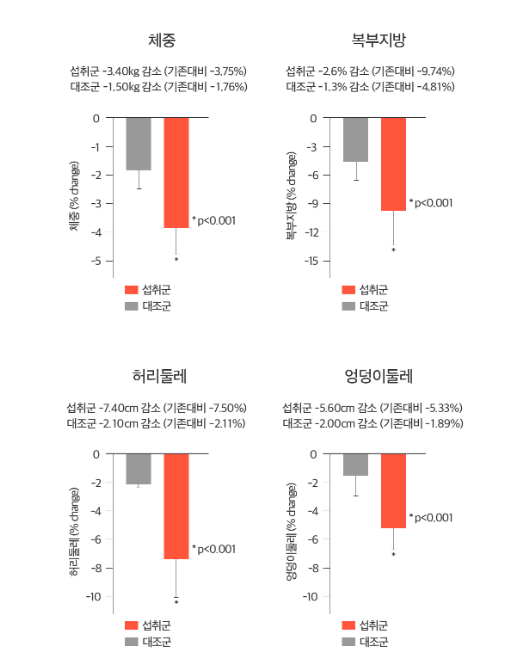 기능성 원료인 시네트롤 인체적용 시험 결과 복부지방, 허리둘레, 엉덩이둘레 감소 확인, 허리/엉덩이 둘레 비율 감소 확인, 체중 감소확인, BMI감소 확인, 체지방량 감소가 확인되었습니다.
