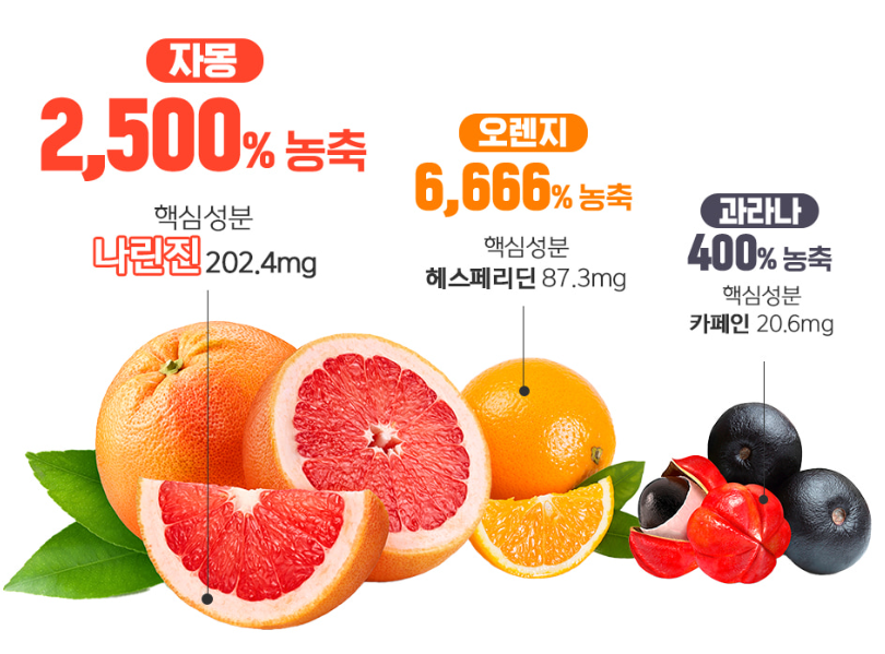 체지방 감소에 도움을 줄 수 있는 나린진 성분이 바로 핵심인데요. 나린진은 자몽, 오렌지, 유자 등에 함유된 플라보노이드로 자몽의 쓴맛을 내는 성분으로도 알려져 있습니다.
