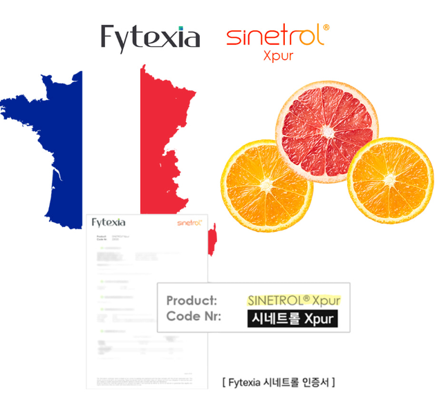 Fytexia사는 프랑스 몽벨에 위치하고, 프리페놀을 전문적으로 연구하는 기업입니다. 시네트롤은 자몽, 오렌지, 과라나 등 다양한 폴리페놀 성분을 함유한 100% 식물성 소재로 이루어져 있습니다.