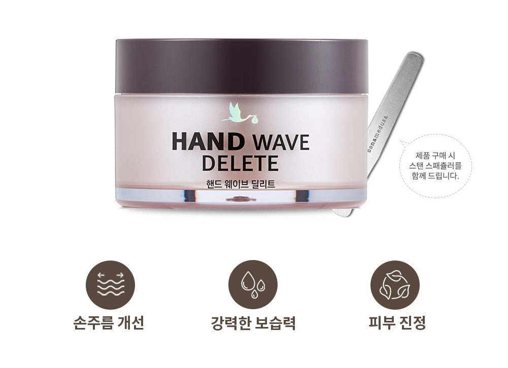 동안의 완성, 손주름까지 완벽하게 지우는 핸드 웨이브 딜리트는 손주름 집중개선, 강력한 보습과 영양, 피부진정 세 가지 효과를 한 번에 누릴 수 있는 획기적인 핸드크림입니다. 핸드 웨이브 딜리트는 일반적인 핸드크림과 달리 꾸준히 사용하면 주름개선에 도움을 주는 주름개선 기능성 제품입니다.