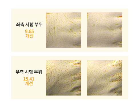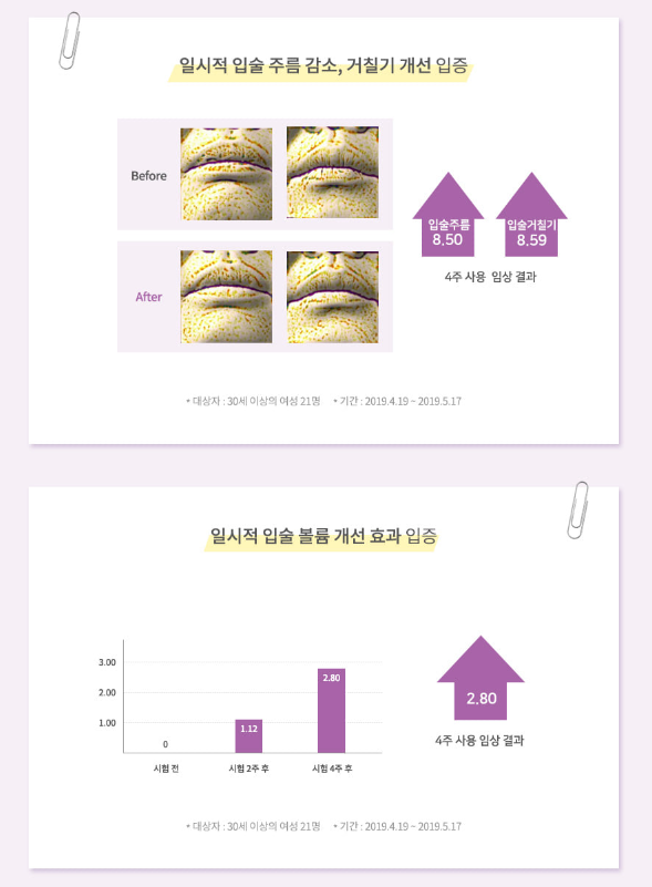 대한피부과학연구소에서 임상시험을 진행한 결과 일시적 입술 주름 감소, 입술 볼륨 개선, 입술 표면 거칠기 개선에 대한 효능이 입증되었습니다.