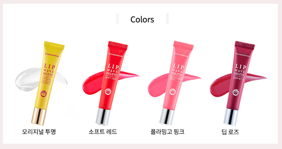 립 웨이브 딜리트 색상은 오리지널 투명, 소프트 레드, 플라밍고 핑크, 딥 로즈 4가지가 있습니다. 립 웨이브 딜리트는 밤에 잠들기 전 충분히 발라주고 필요시 수시로 덧발라 주어도 좋습니다.